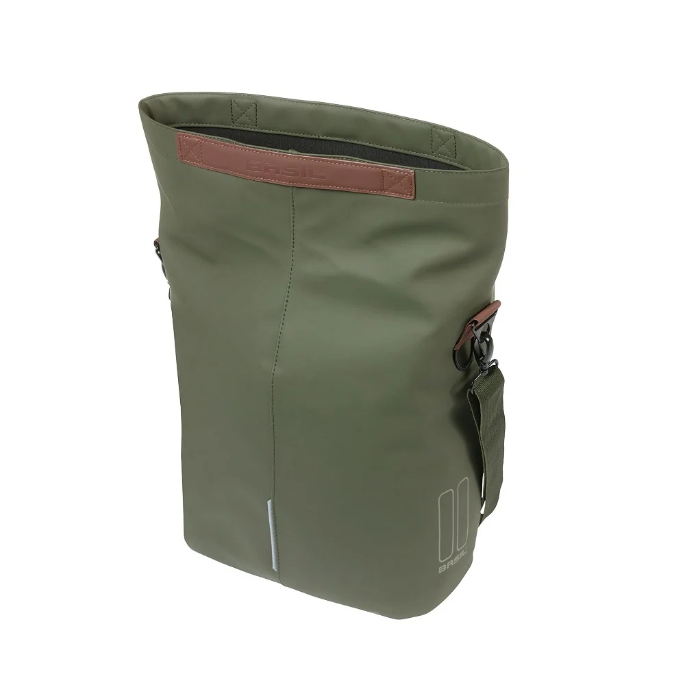 Deze groene enkele fietstas alias schoudertas en shopper heeft een waterkerende vouwsluiting met magneet, Hook-On-systeem en reflectie. En de praktische City Shopper met vegan leather details is óók nog eens elegant.