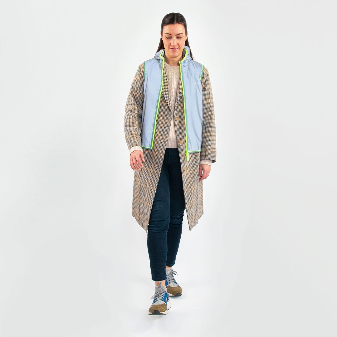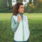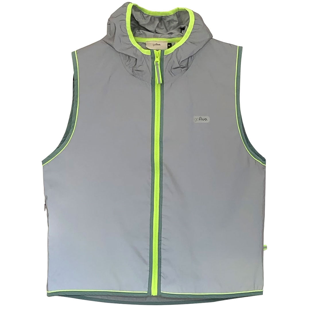 Deze hoodie is gemaakt van een winddichte, waterafstotende, reflecterende stof. Dit design heeft een langere rugzijde, en een dubbele rits die je naar het midden kan schuiven voor meer bewegingsvrijheid tijdens het fietsen. Het hesje is afgewerkt met één zijzakje, en fluogele & -groene details.