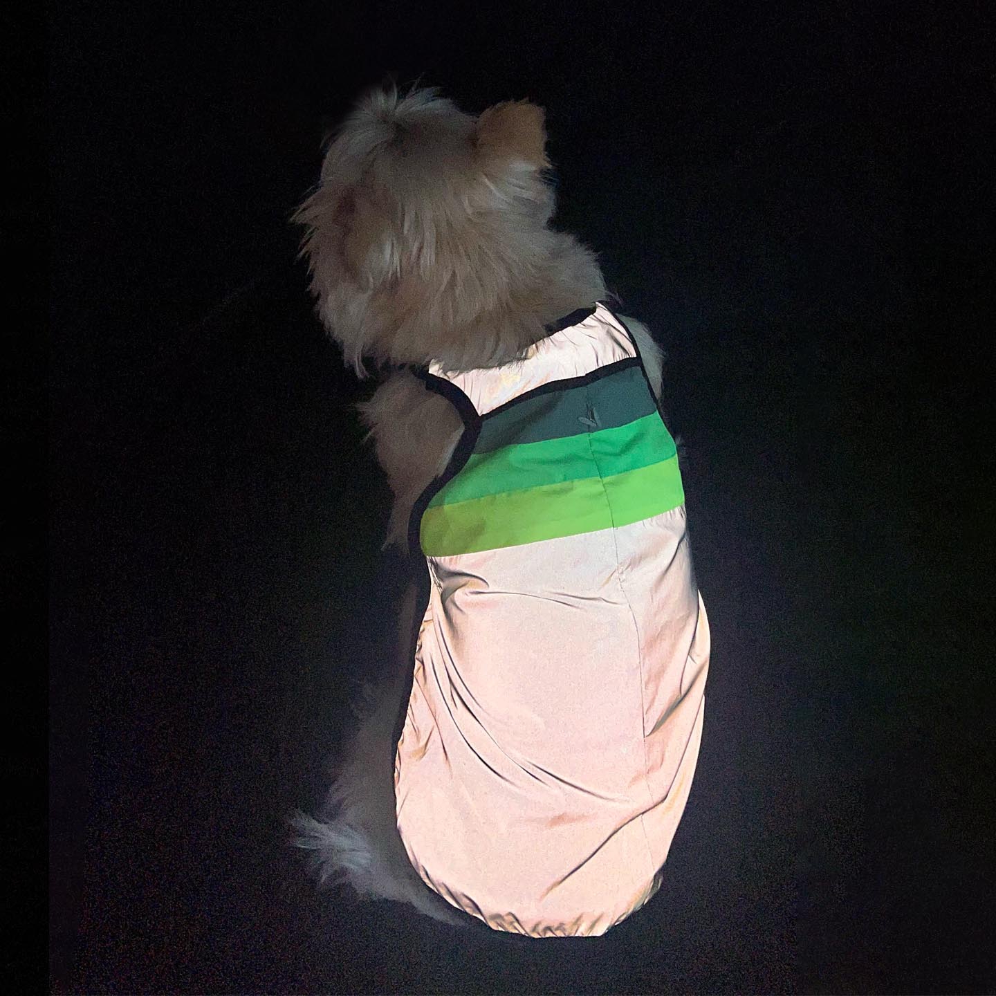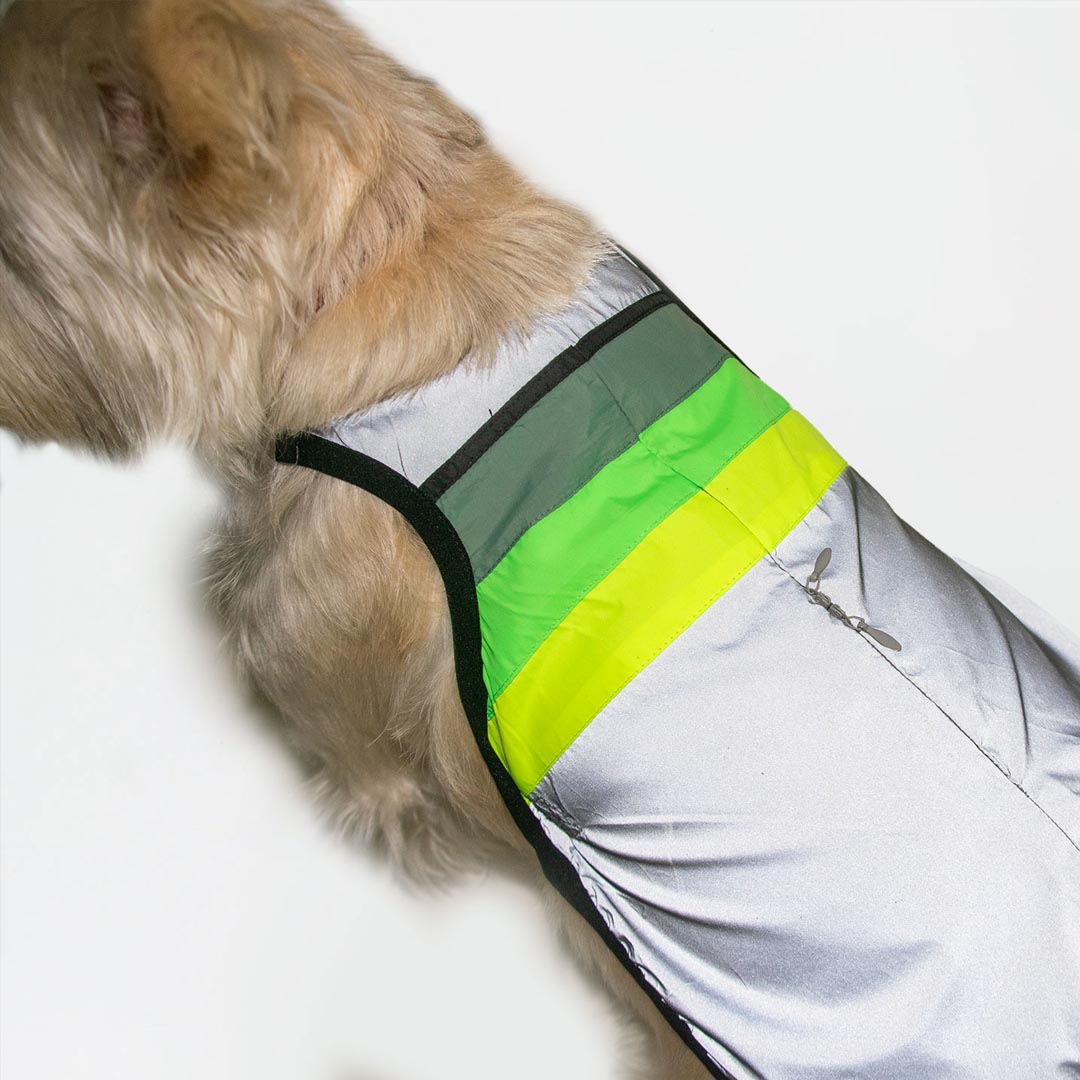 Dit hesje gebruik je om dag & nacht goed zichtbaar te blijven. De reflecterende stof maakt onze hondjes extra zichtbaar in het donker. De fluo strepen, geïnspireerd op de groene gloed van het noorderlicht zorgen dat ze ook overdag de show stelen. Als je hond een hondentuigje draagt, kan je dat aan laten.