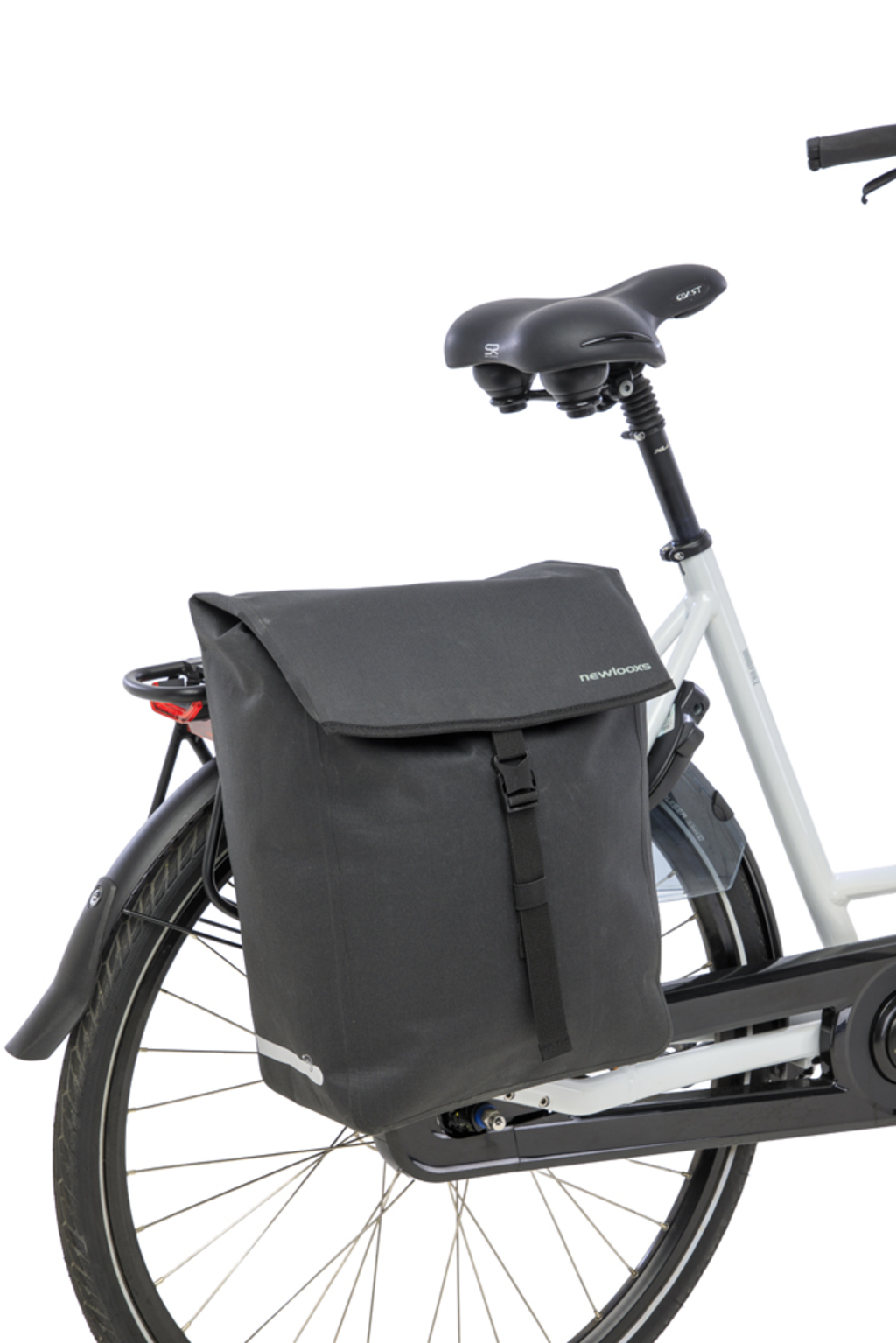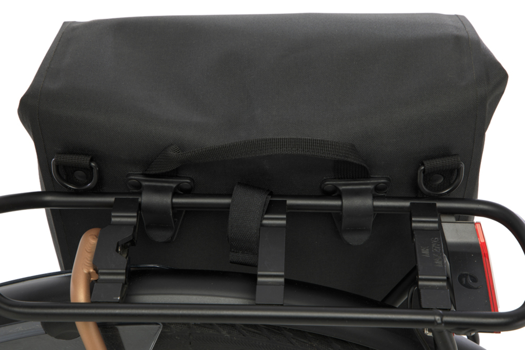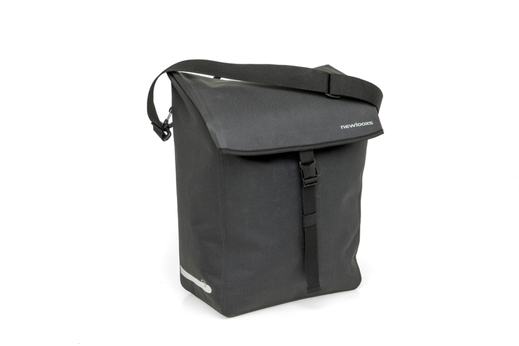 De New Looxs Hamar Single is een volledig waterdichte enkele fietstas en schoudertas in één, gemaakt van gerecycled polyester. Ideaal voor elektrische fietsen en voorzien van New Looxs haken voor stevige bevestiging op de bagagedrager. De tas heeft een extra ritsvak, reflectie aan beide zijden voor extra zichtbaarheid, en een afneembare, verstelbare schouderband. Dankzij de kliksluiting is hij eenvoudig in gebruik. Een duurzame en praktische keuze voor dagelijks woon-werkverkeer of fietstochten.